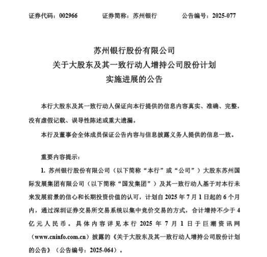 10月9日,苏州银行发布公告,该行大股东苏州国际发展集团有限公司(以下简称“国发集团”)及其一致行动人基于对本行未来发展前景的信心和长期投资价值的认可,计划自2025年7月1日起的6个月内,通过深圳证券交易所交易系统以集中竞价交易方式,合计增持不少于4亿元该行股份,增持资金来源为自有资金股票配资公司行业门户,且计划完成后6个月内不减持本次增持股份。